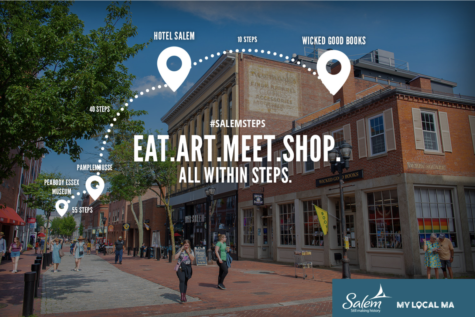 “All Within Steps” allowed us to speak about the broad offerings of the city, while focusing on walkability and proximity. We brought in GPS iconography, using “steps” as our unit of measurement to give a sense of closeness. We used a broad array of photography to appeal different audiences — history buffs, occult pilgrims, pub crawlers, curious parents, foodies, retail seekers & more.